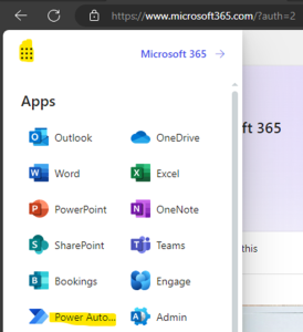 Go to https://www.microsoft365.com – on upper left corner choose the 9 dots and go to the Power Automate.