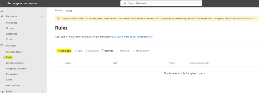 - In the EAC, go to Mail flow > Rules and select New > Create a new rule.