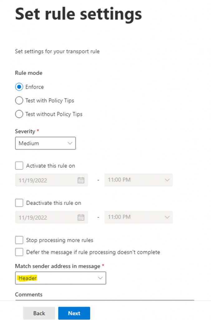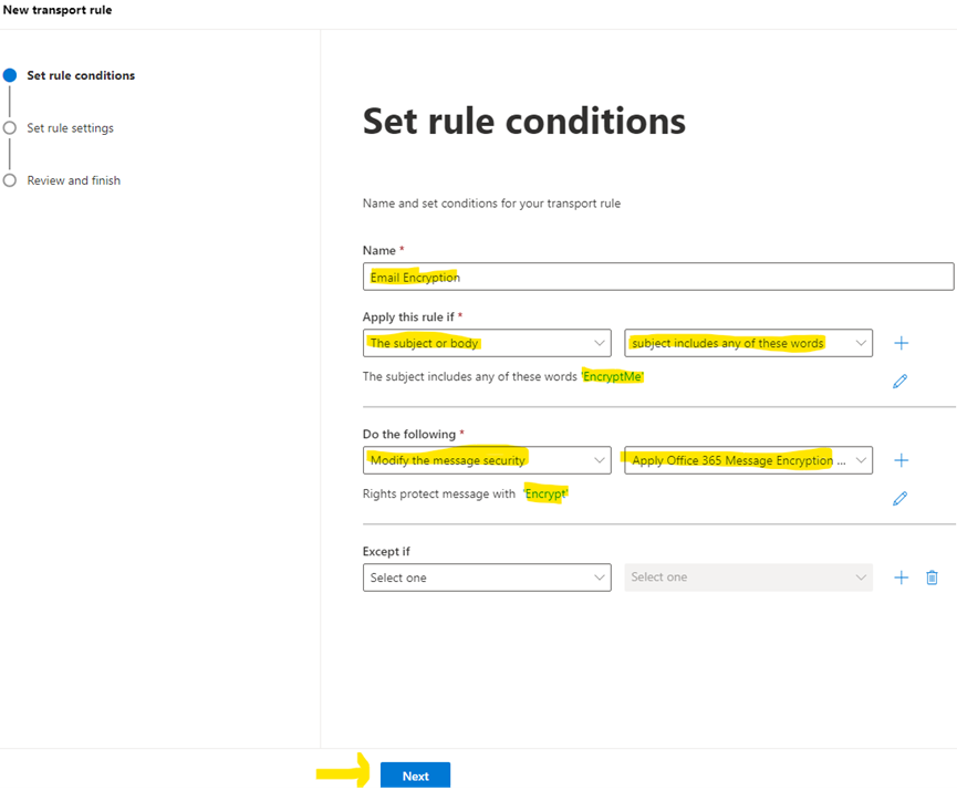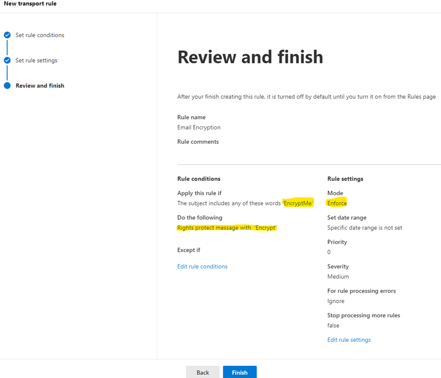 7. To enable message encryption, from Do the following, select Modify the message security and then choose Apply Office 365 Message Encryption and rights protection. Select an RMS template from the list, in our example select encrypt.