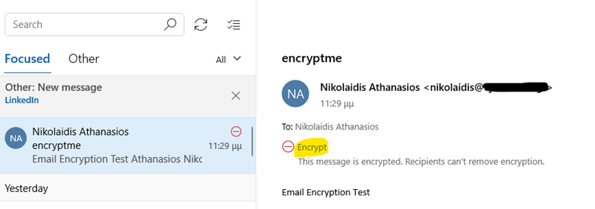 Microsoft Purview Message Encryption provide us the ability to deliver encrypted messages to internal or external recipients. Users can send encrypted emails to any email account, including Gmail, Yahoo! Mail, and Outlook.com. For information about email encryption options for your Microsoft 365 subscription see the Exchange Online service description