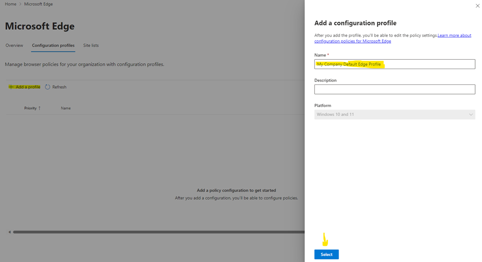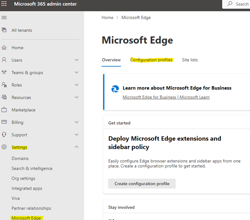 Expanding settings, Microsoft edge and go to configuration profiles.