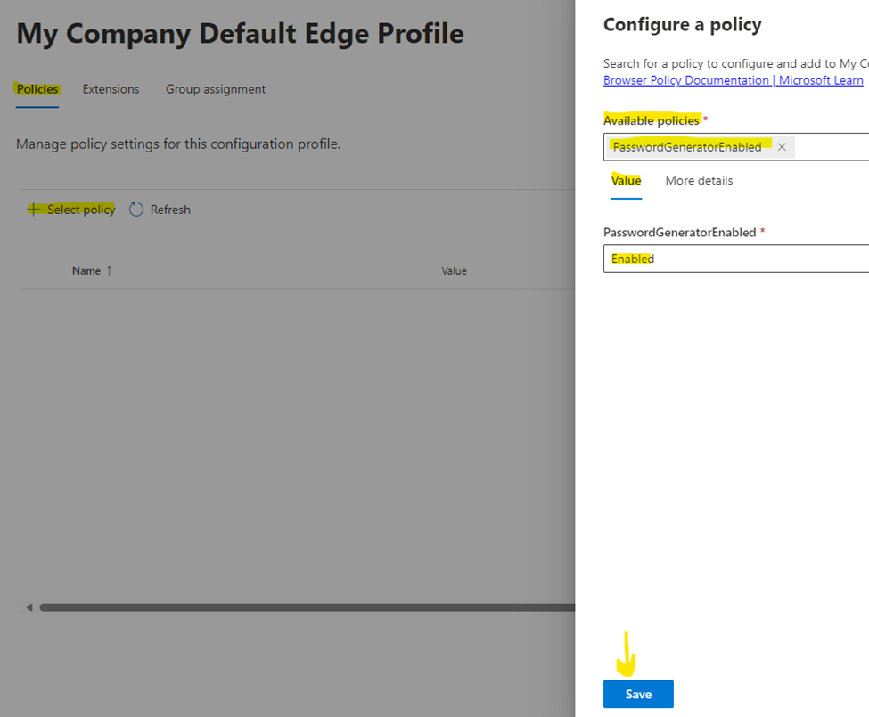 Under Configure a policy, search for the policy you want to configure for this profile. Set the configuration settings/values for the policy you select. In our example we will use PasswordGeneratorEnabled policy that the Allow users to get a strong password suggestion whenever they are creating an account online. Select Save.