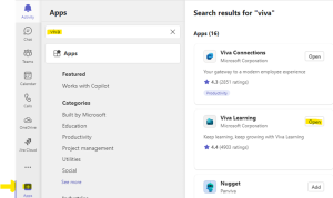 In order to add the app to Teams, go to Teams, select the app button, and add Viva Learning to your Teams app.