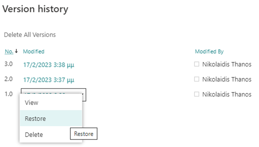 We may keep, track, and restore list items and library files as they change when versioning is enabled in our list or library. Both major versions such as those in which a new section of a document was added and minor versions such as those in which a spelling error was fixed can be tracked by libraries. Lists are limited to major version tracking. You can access an older version of a document or list item by using the Version History feature in SharePoint. Versioning is enabled by default on your SharePoint Online document library. When a save action happens, SharePoint creates a new version along with metadata such as, who saved the item, when it was produced.