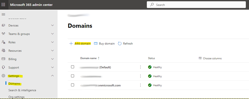 In the Microsoft 365 admin center, choose Settings and select domains