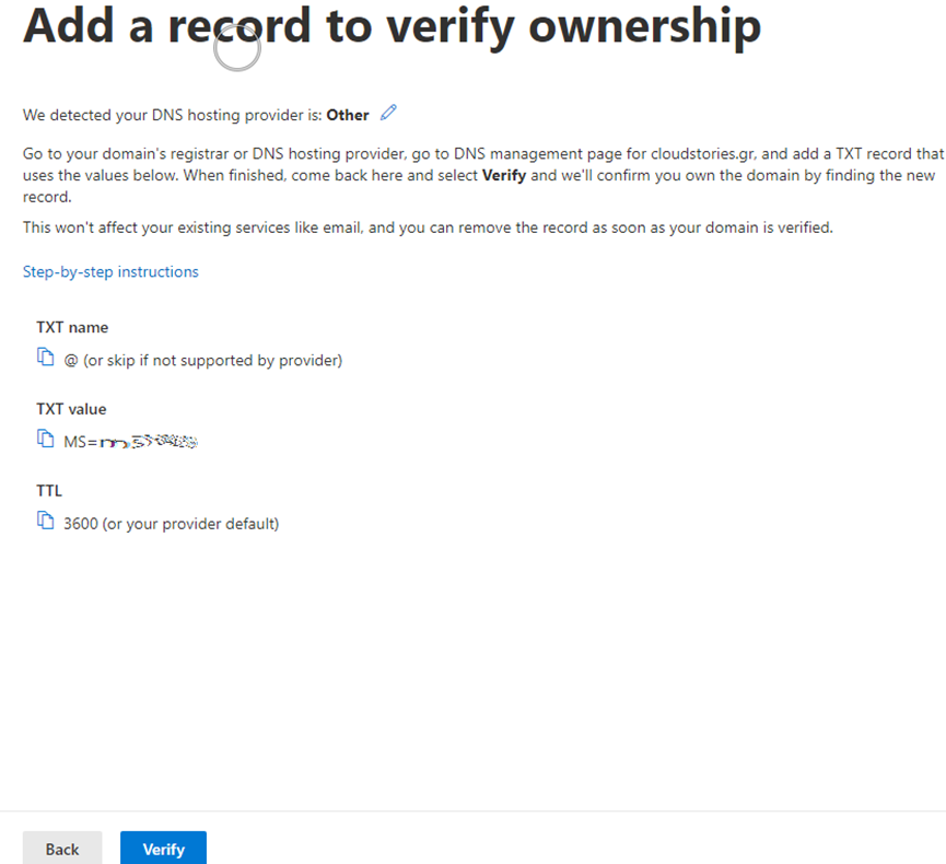 First, we must create a TXT record to verify our domain.